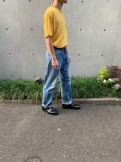 まず色に関しては腿の部分がかなり薄めになっていますが、全体的に綺麗なサックスブルーのような色になっていて、古着との相性がとても良いと思います。