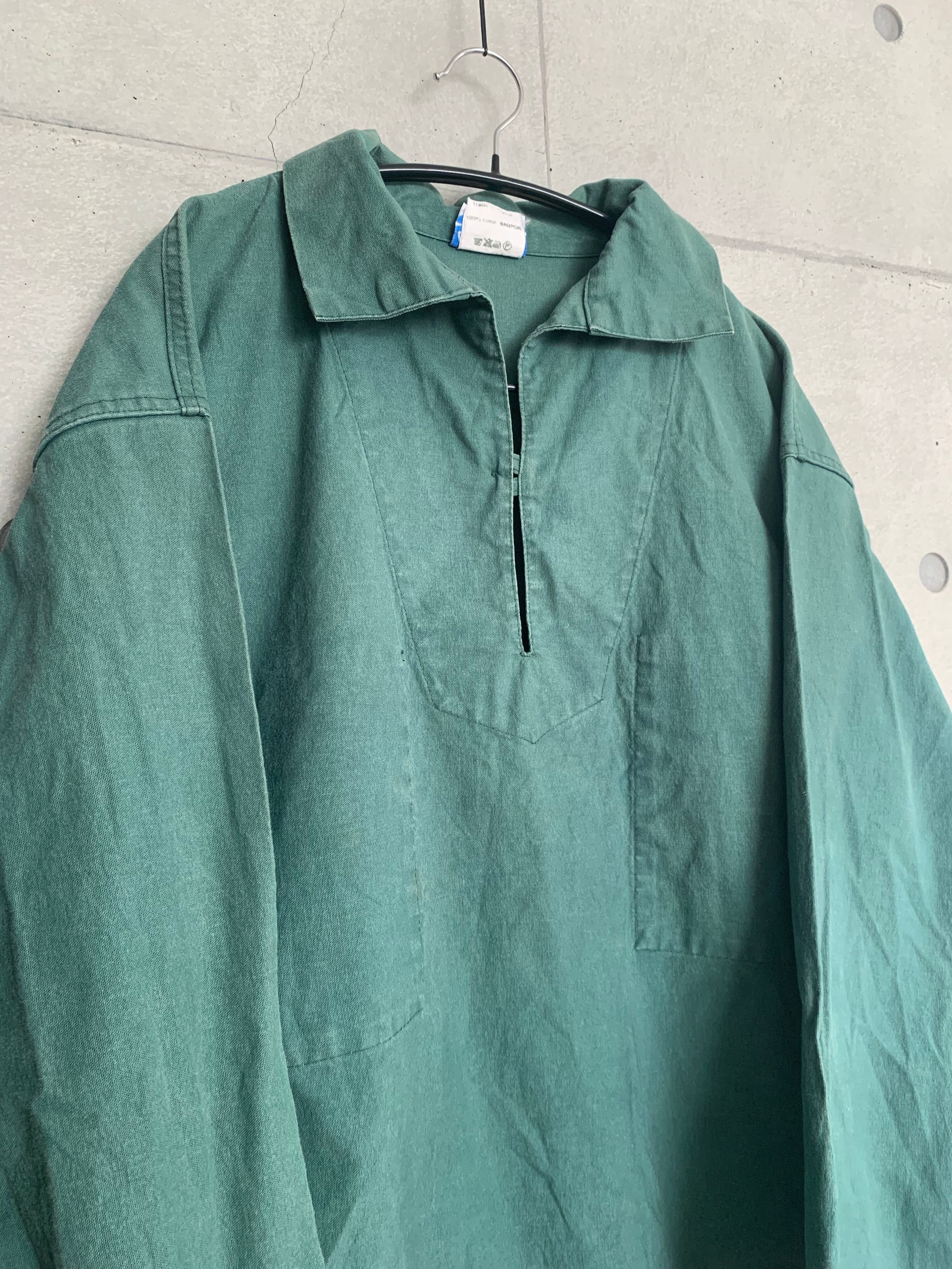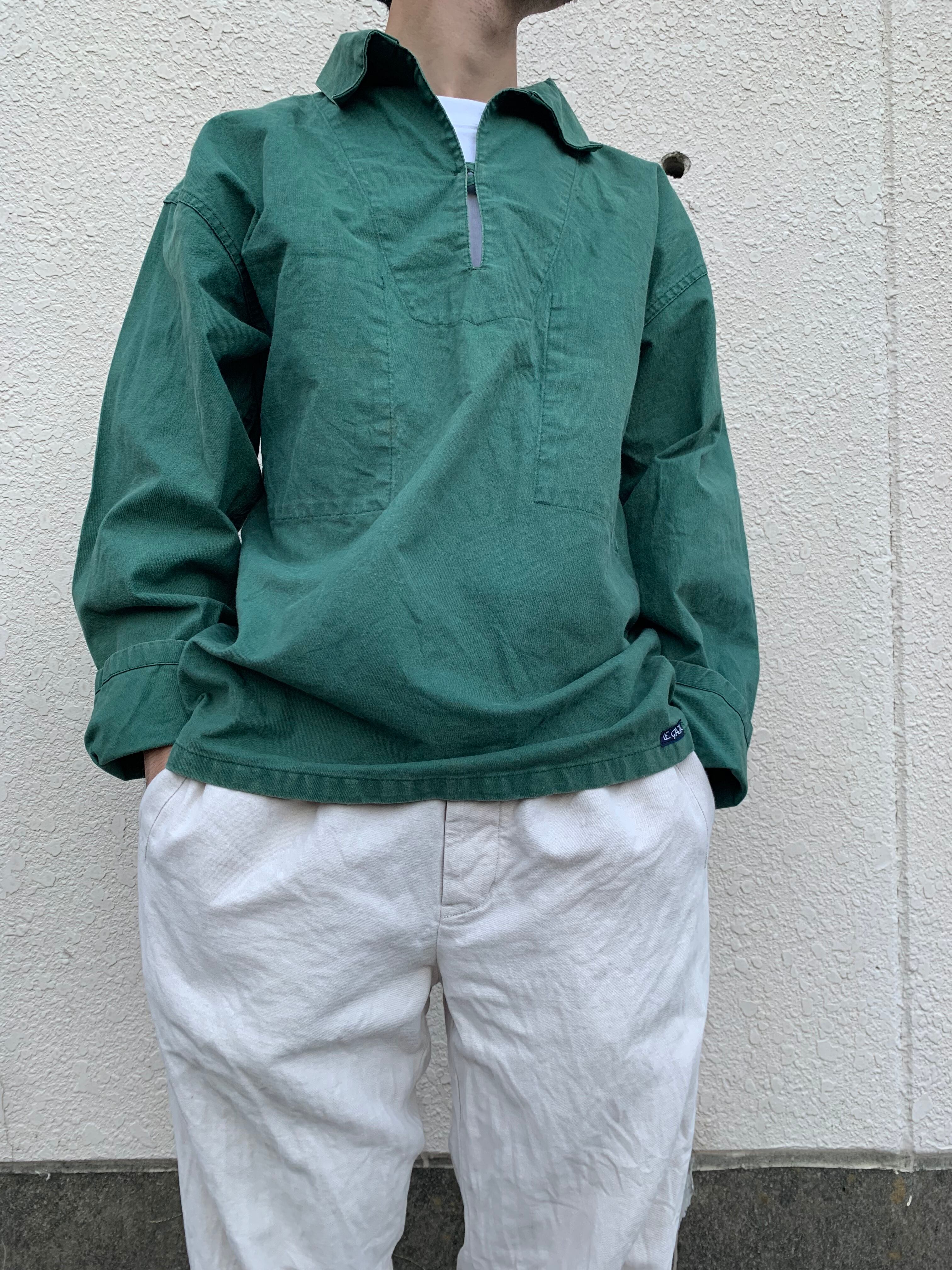 またフロントのディテールはフレンチのフィッシャーマンスモックによくみられるもので、ボタンを留めた時と開けた時の2種類の着方を楽しめるようになっております。