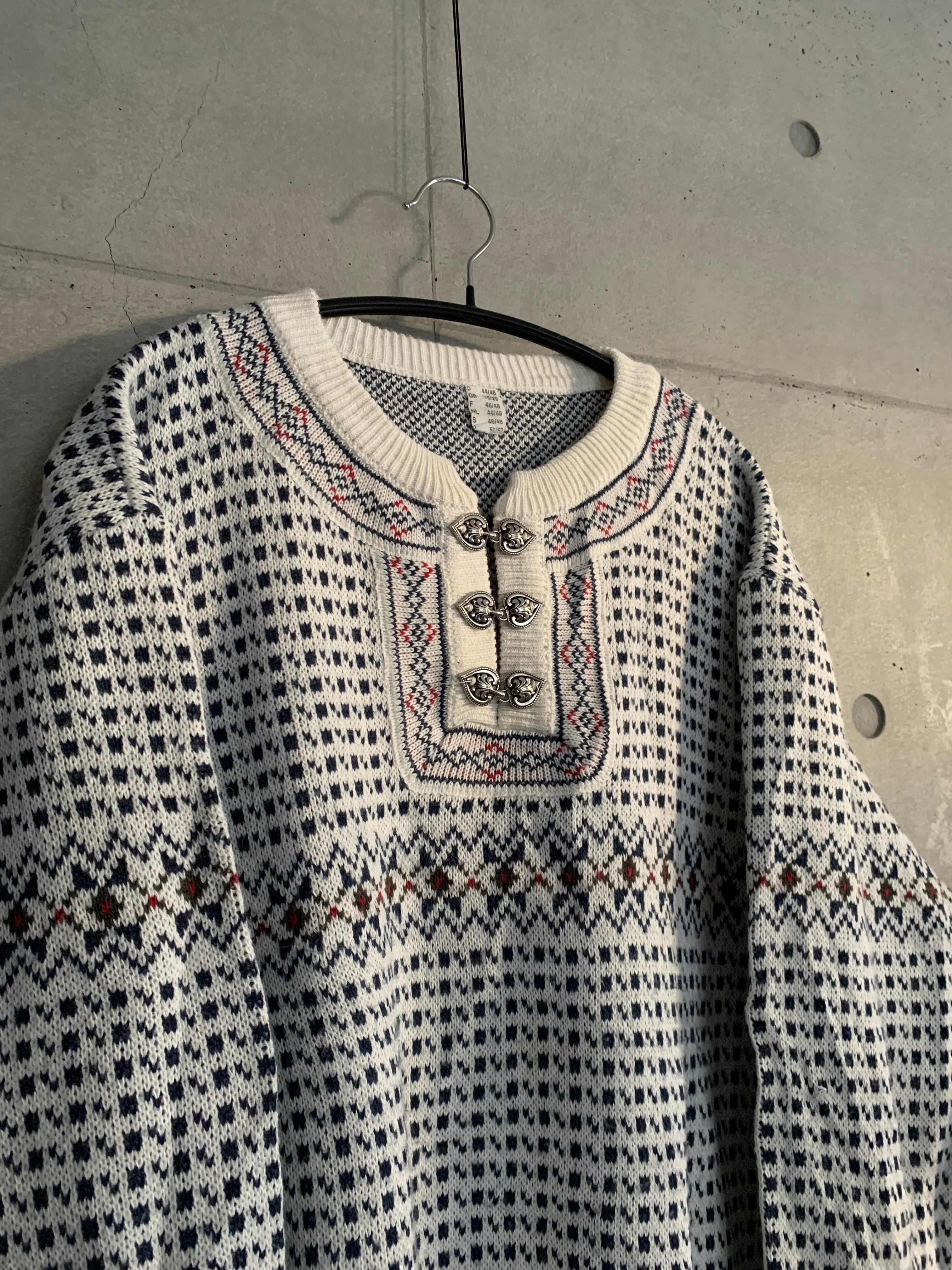 柄はチロリアンニットによく見られる代表的な物で、形と色使いが可愛い一着になっております。