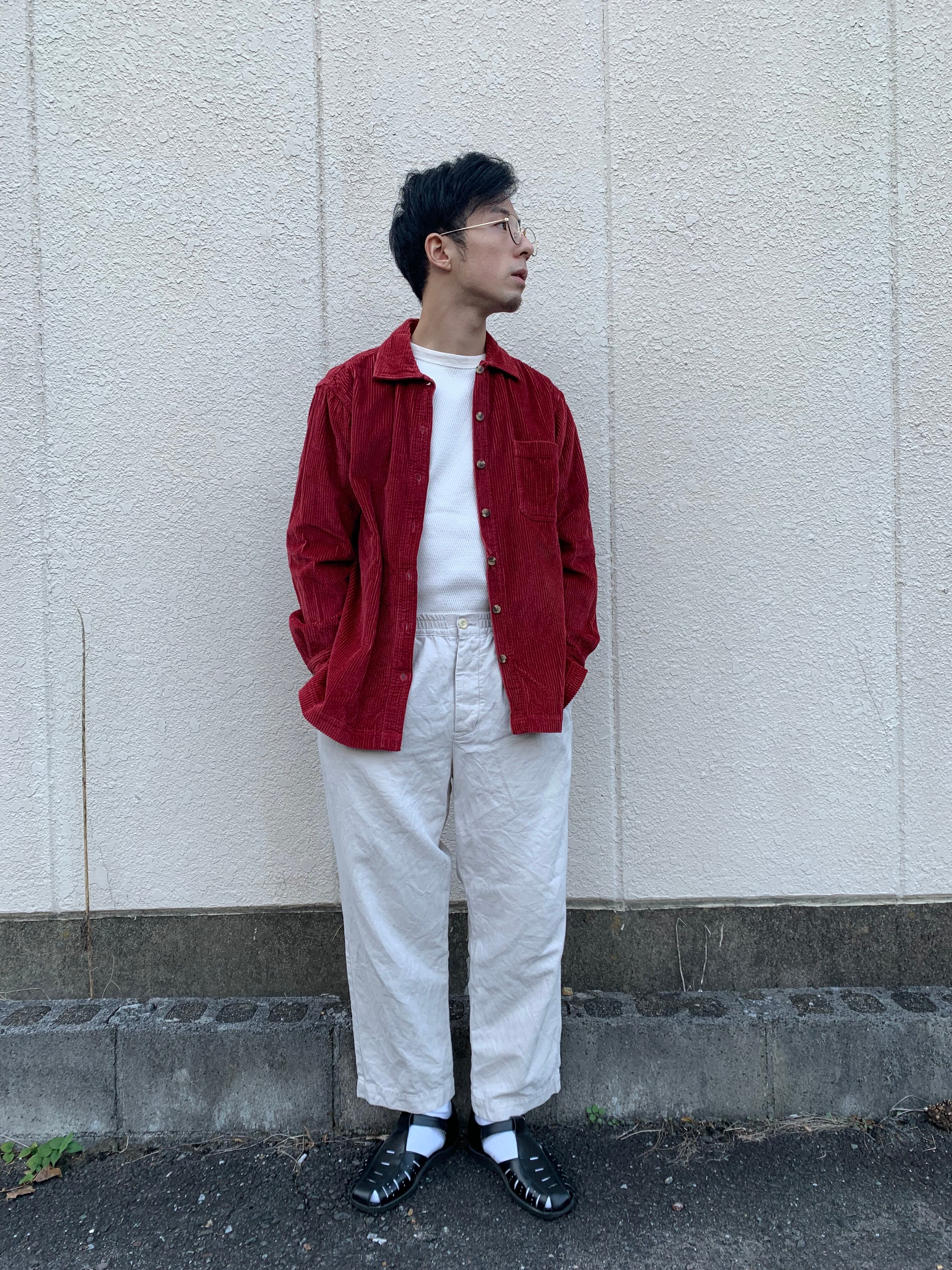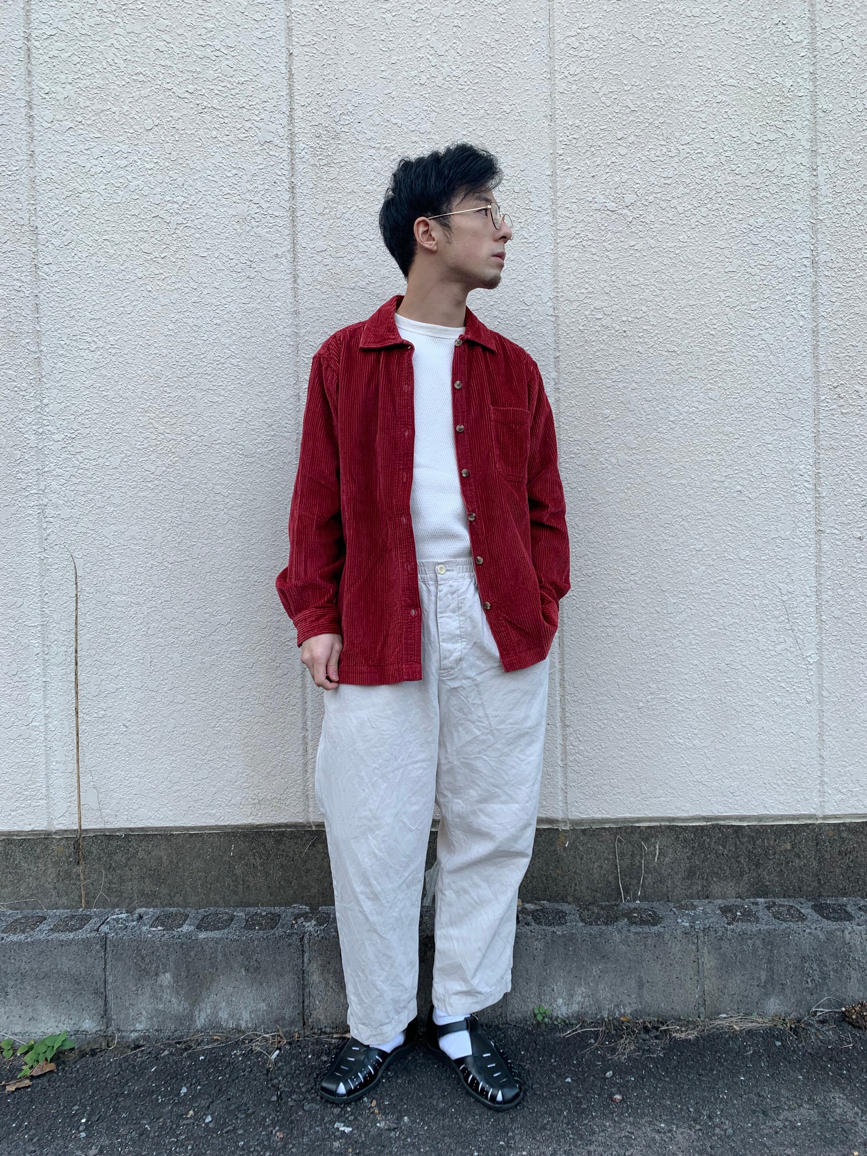 冬は全体的に服のトーンが落ちるので、インナーでこちらのシャツをアクセントとして挟むと、スタイリングの幅が広がるかなと思います。コーデュロイということもあって保温性も高いので、これからの季節に是非。