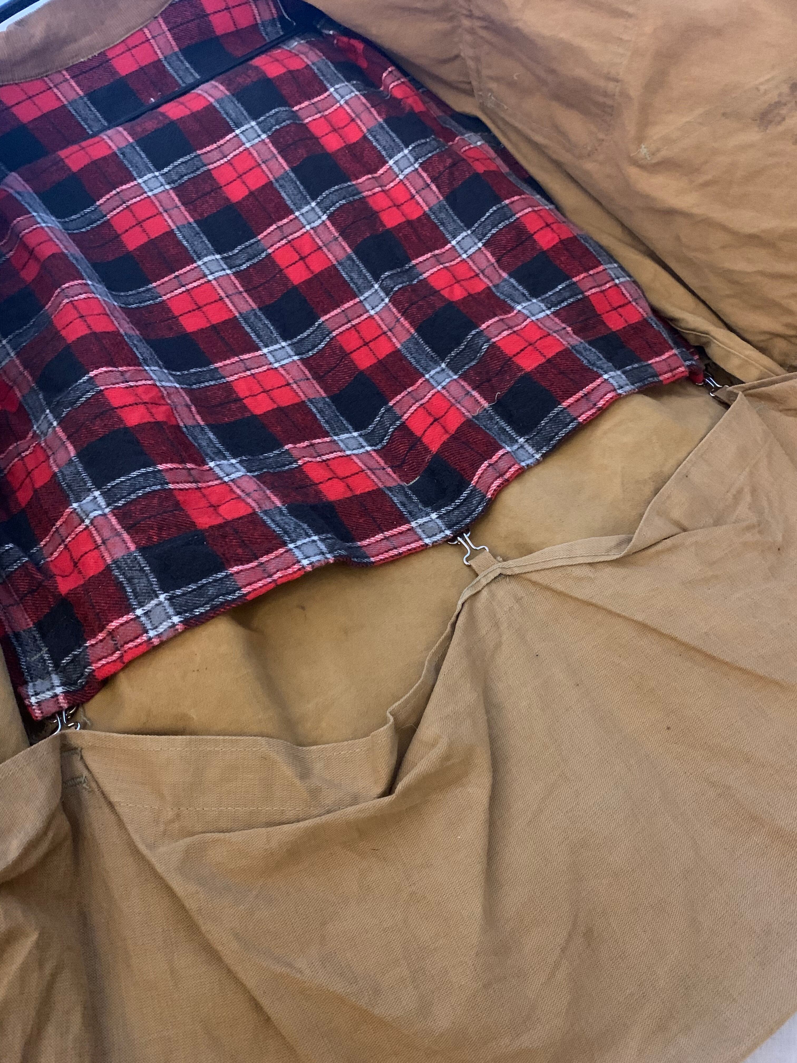 また背中の内側部分にはゲームポケットという獲物を入れておくための大きなポケットが付いていて、これがハンティングジャケットで最も特徴的なディテールになるのかなと思います。こちらの個体はこれが裏地とフックで繋がっているもので、そこそこ古いものなのかなと思います。