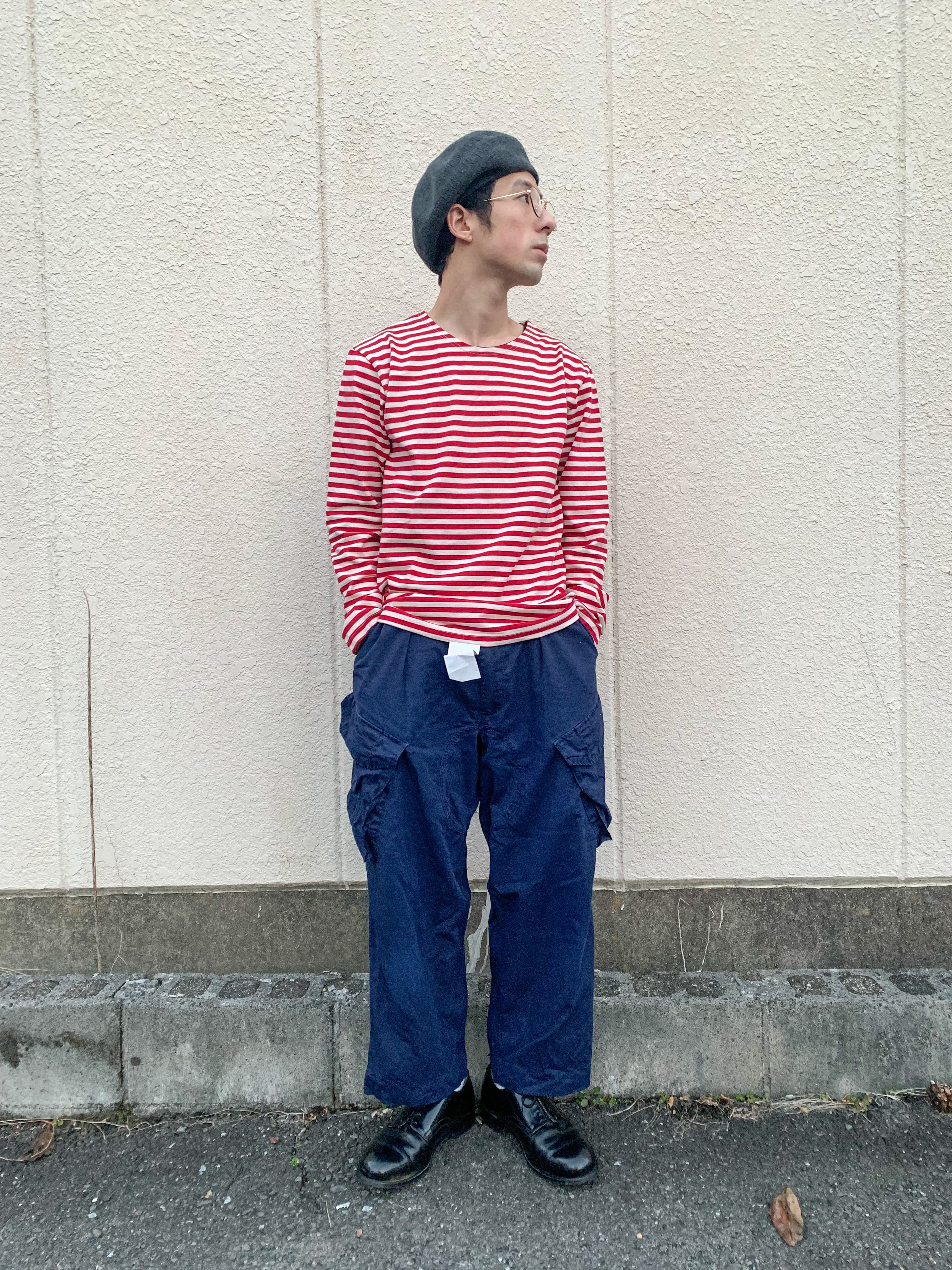 ほんの少しだけゆとりがあるような感じで来ていただきたいと思って、今回はLサイズを仕入れました。ただ着画では結構着丈、袖丈が長めに見えますがデッドストックで一回も洗いをかけていないので、少しだけ縮みが出ると思います。