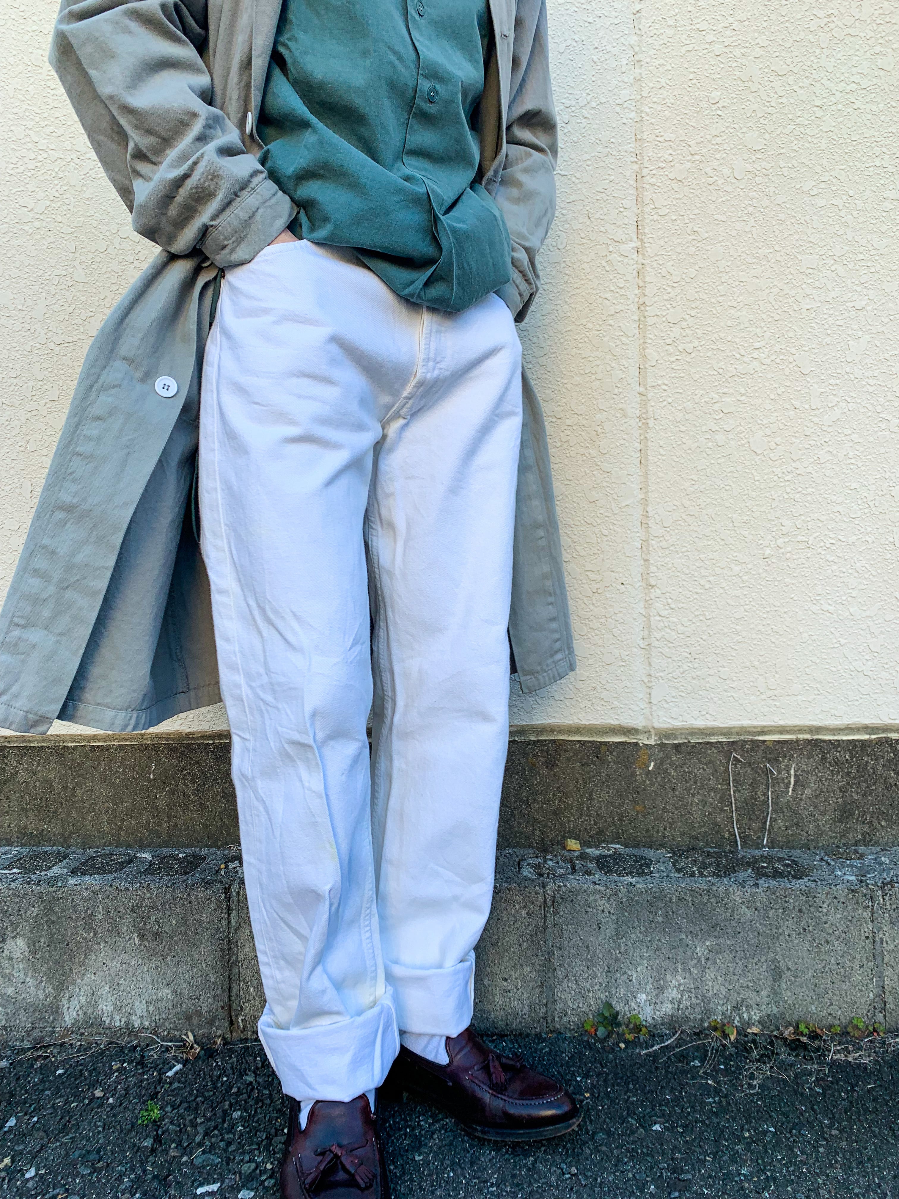 このイギリスメイドの個体はステッチまで白で真っ白な個体になっております。本当にデニムとは思えないほどのクリーンな印象があって、上品な白パンです。お尻と膝裏あたりに少しだけ汚れがあるのですが、後ろ側にあるためあまり目立ちませんし、古着らしい雰囲気もあって個人的にはむしろプラスなポイントです。
