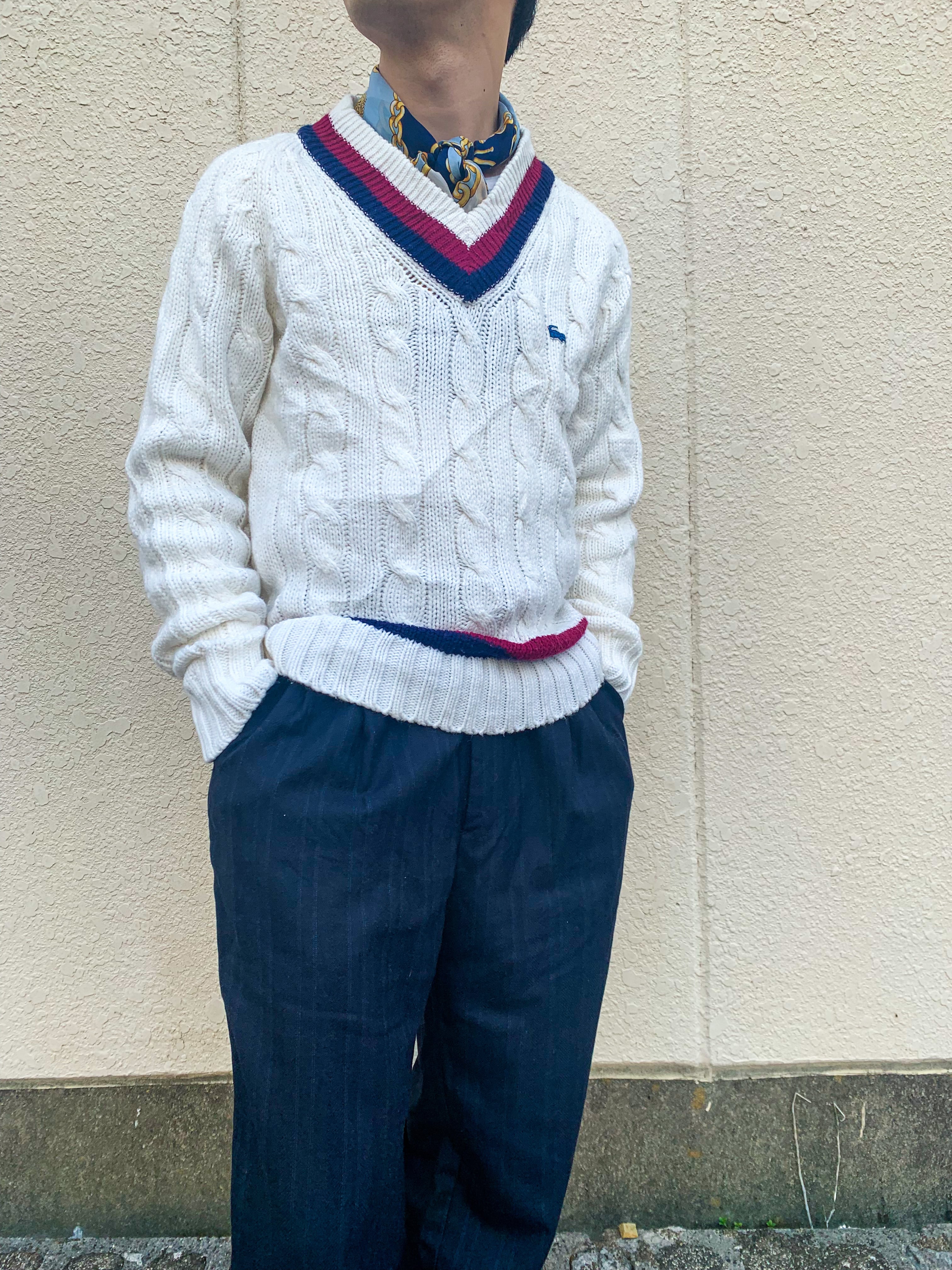 カラーリングと形から、なんとなくスクールライクな雰囲気が出ています。アメリカの高校生がシャツを着てタイアップした上からこのセーターを着てそうだなと見た瞬間に思いました。このアイテムは春秋に一枚で着るのももちろんいいですし、冬にインナーとして挟むとトリコロールがいいアクセントになって、スタイリングを華やかにしてくれます。