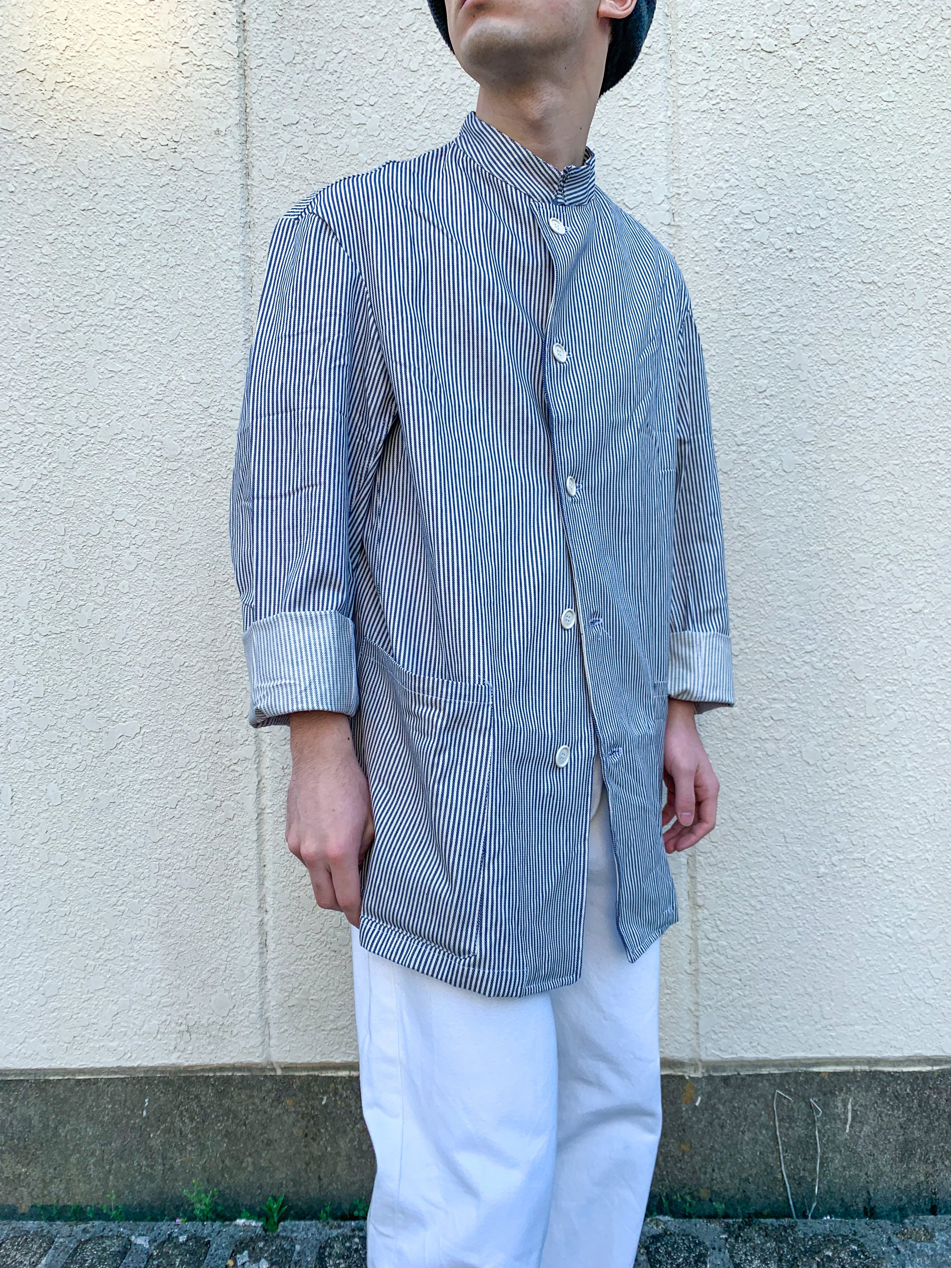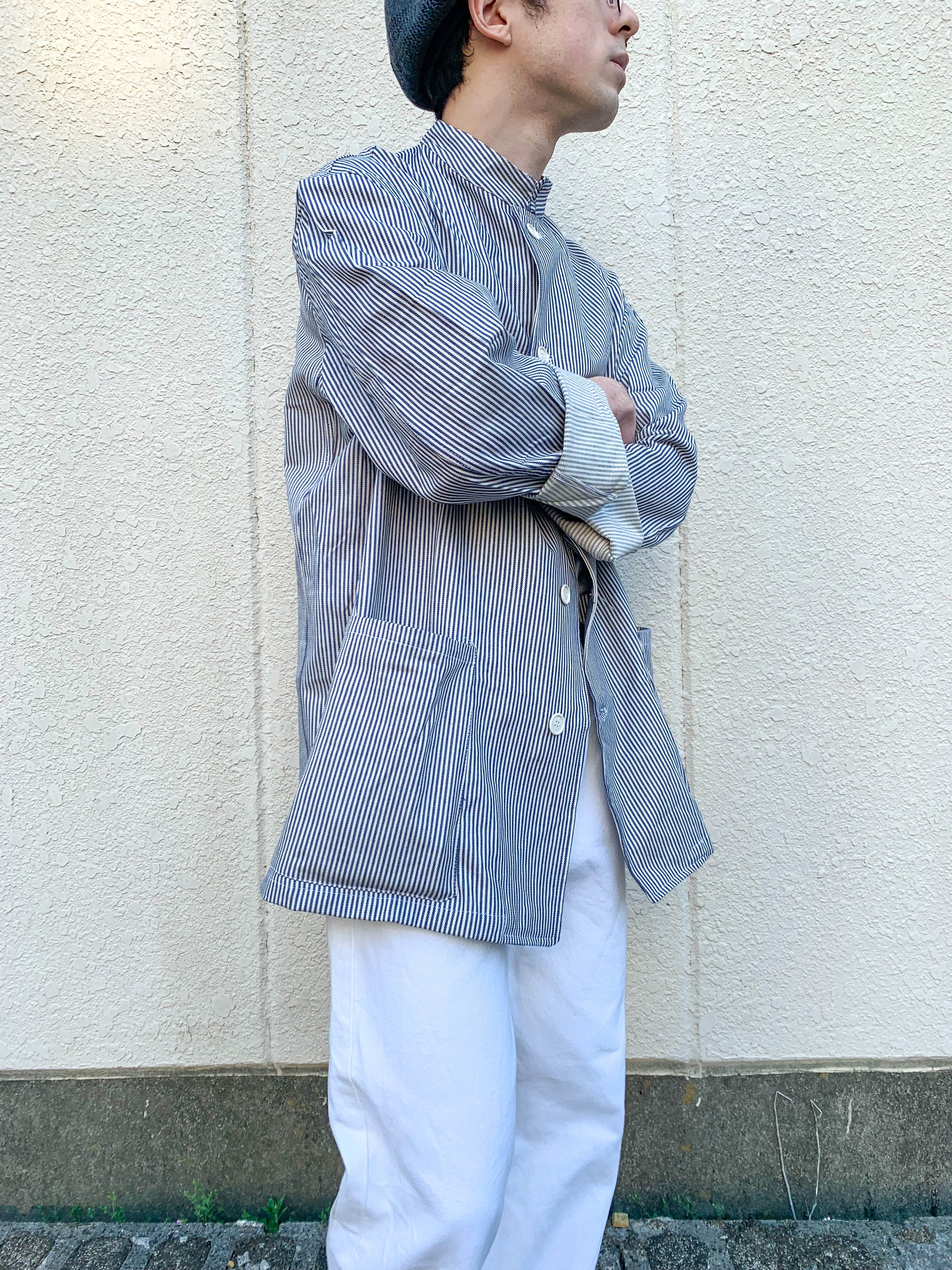 その名の通り軍内の料理人が着ていた服になるのですが、私たちのイメージとしてコックさんの服は真っ白なイメージがあるので、形はゴリゴリにコックジャケットでも、こう言ったストライプが入っているだけでもう都会的に見えてしまう不思議な一着になっております。