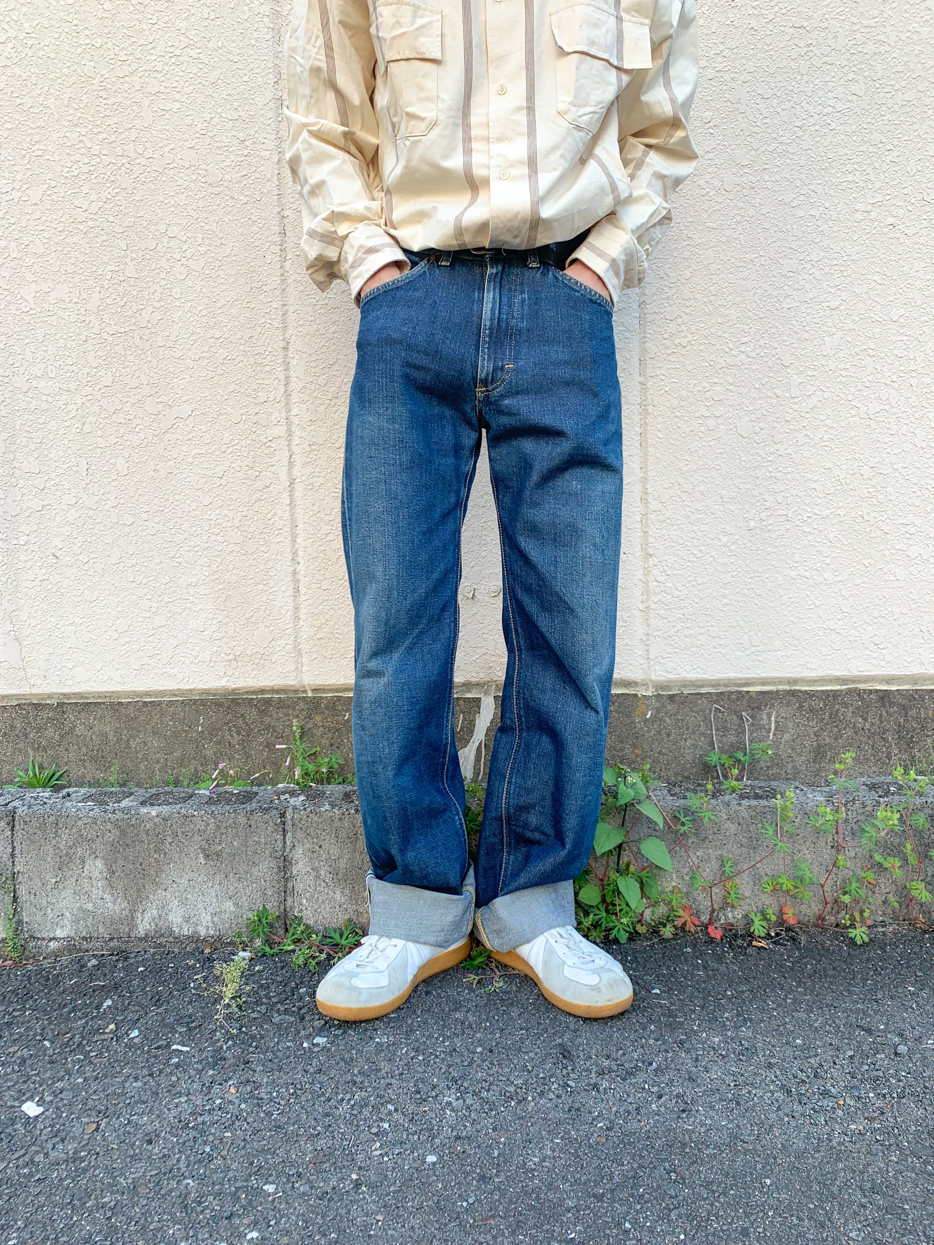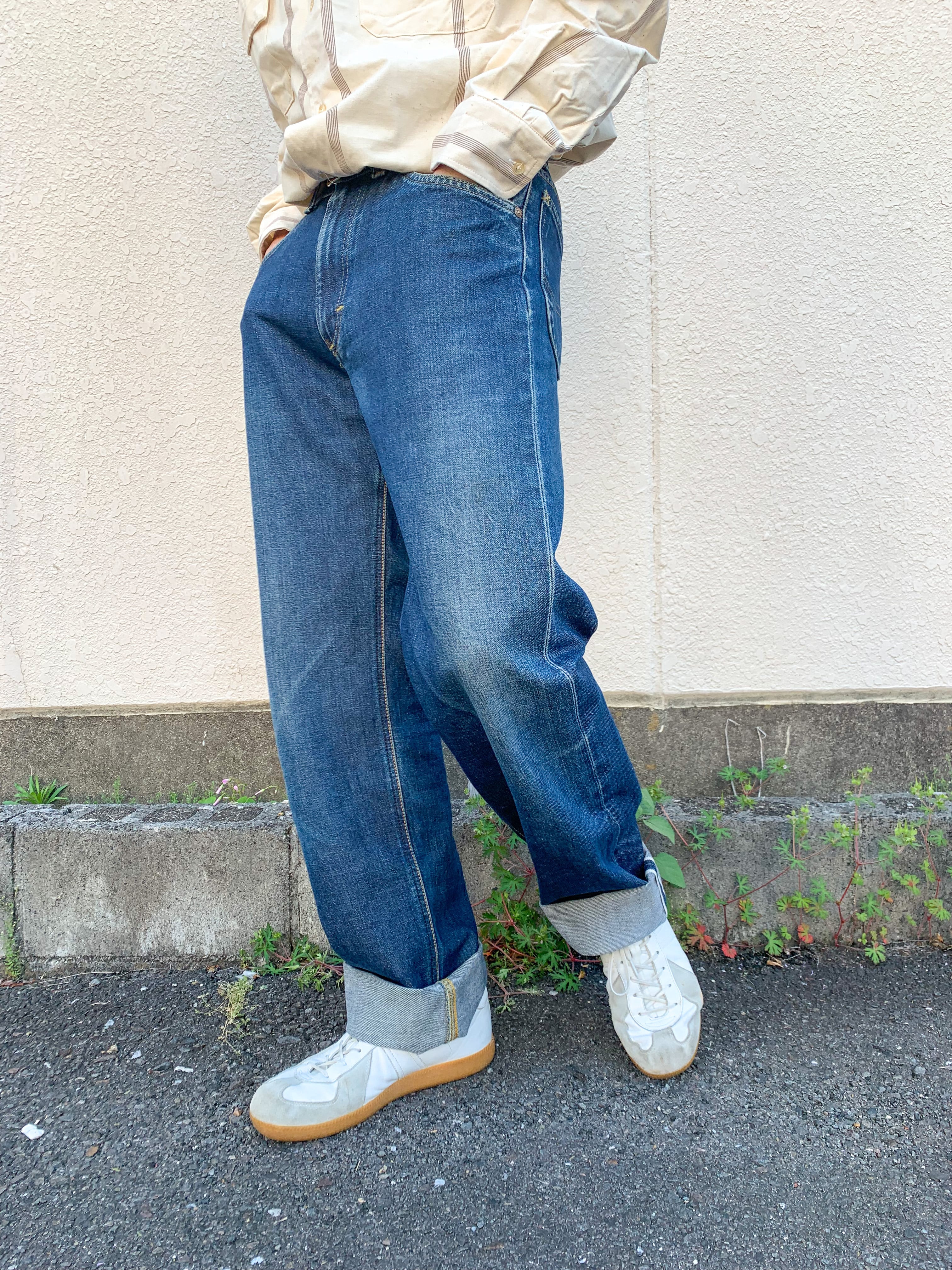 形はlevi's501よりやや太めのストレートシルエット。デニムは太さが本当に大事で、これぐらいの太さだと合わせるアイテムによって綺麗めにもカジュアルにも履けるかと思います。