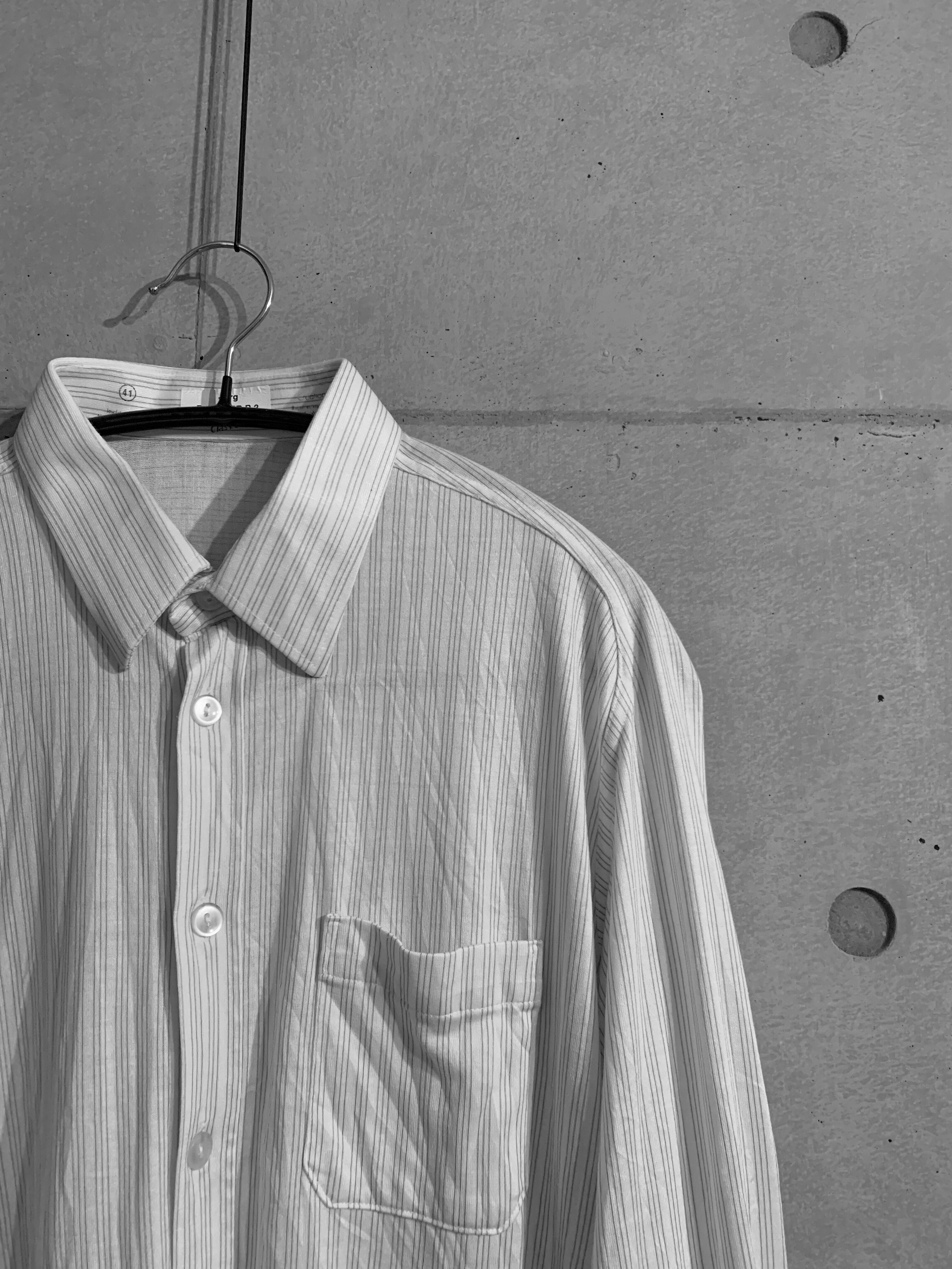柄としてはシンプルなグレーストライプ。フォーマルなシーンでも使えそうな柄で、かなり爽やかな印象を受けます。こういう一見何でもない柄のシャツって気づいたら一番着てるってタイプなんですよね...笑