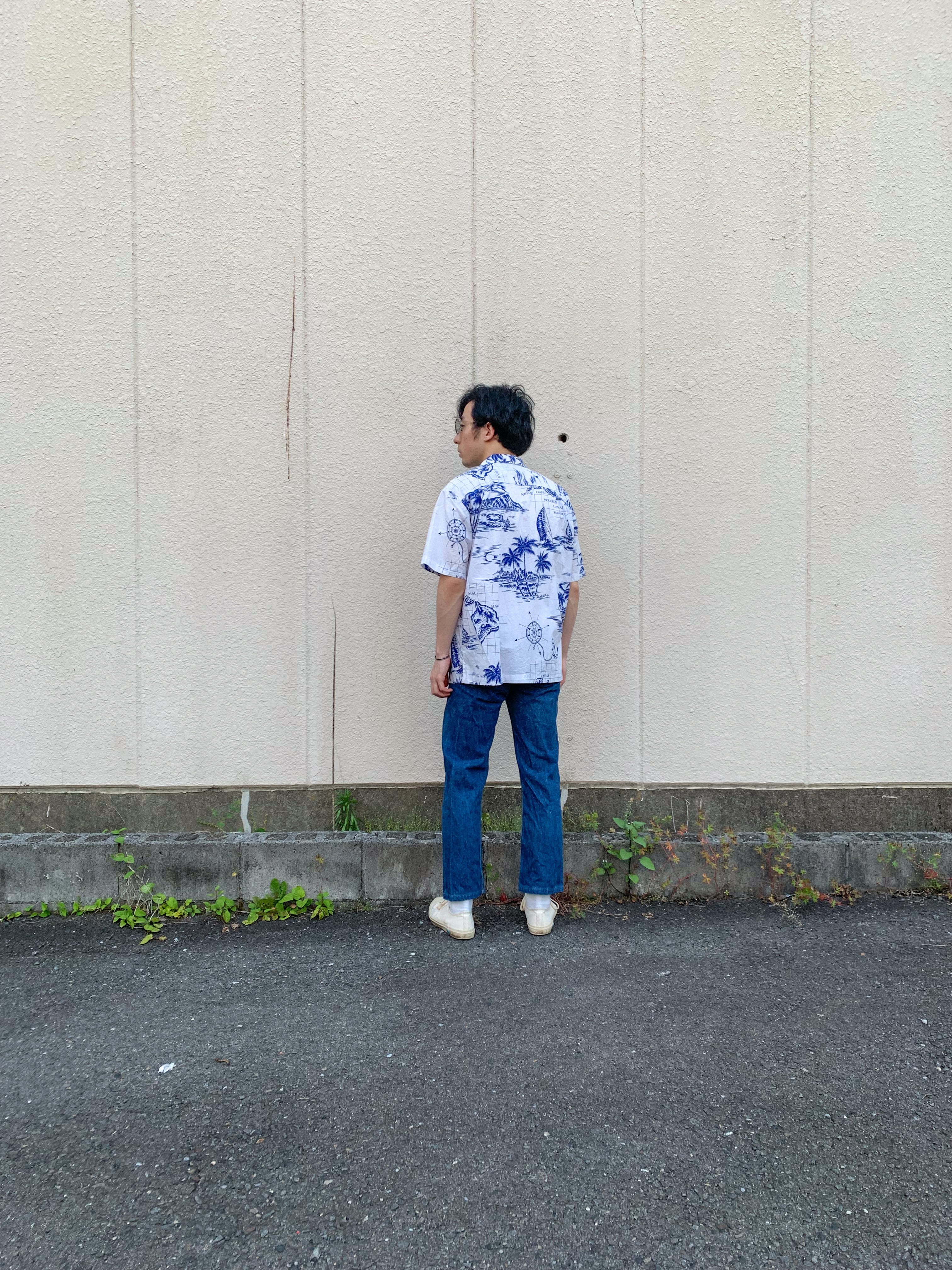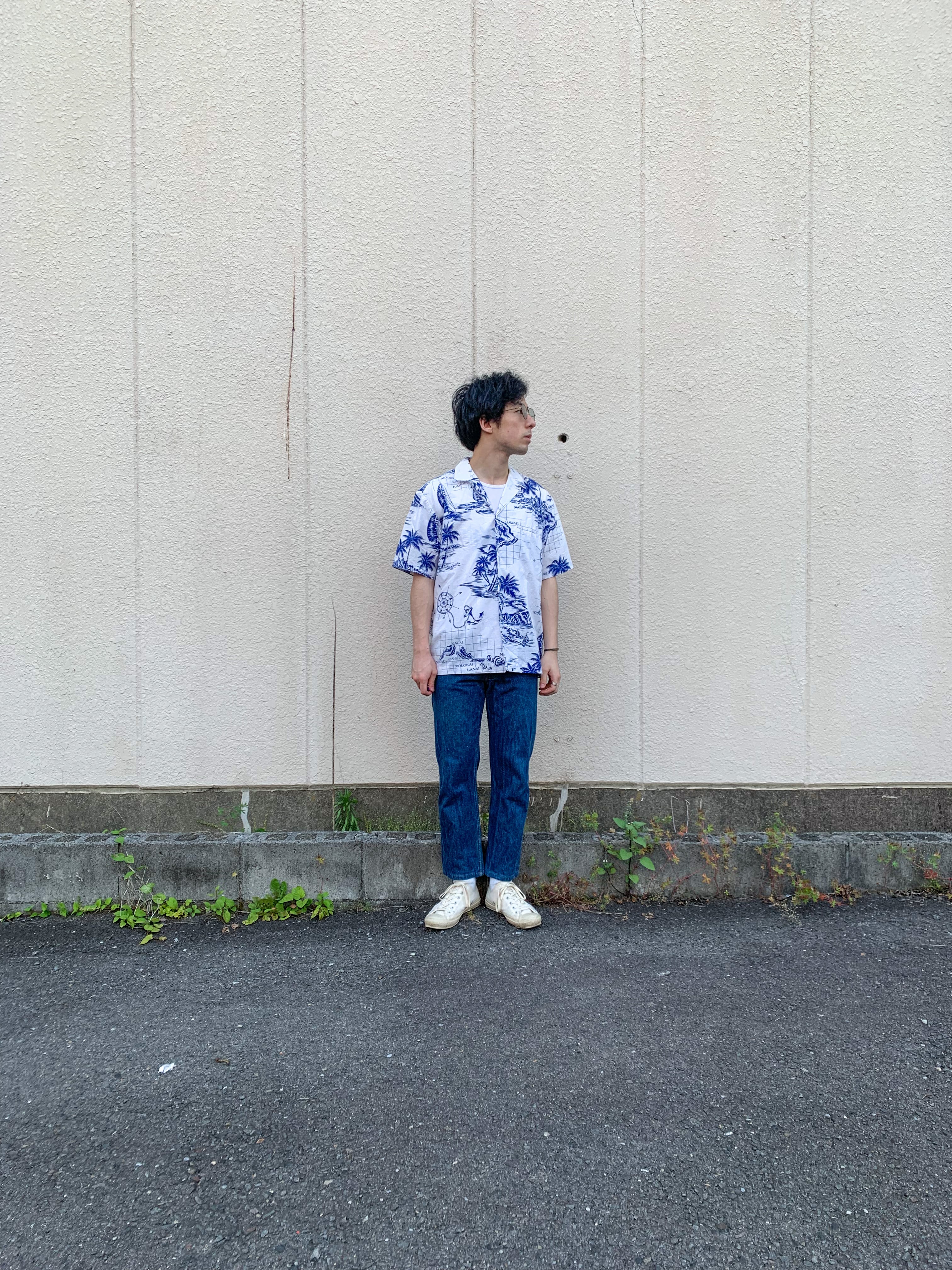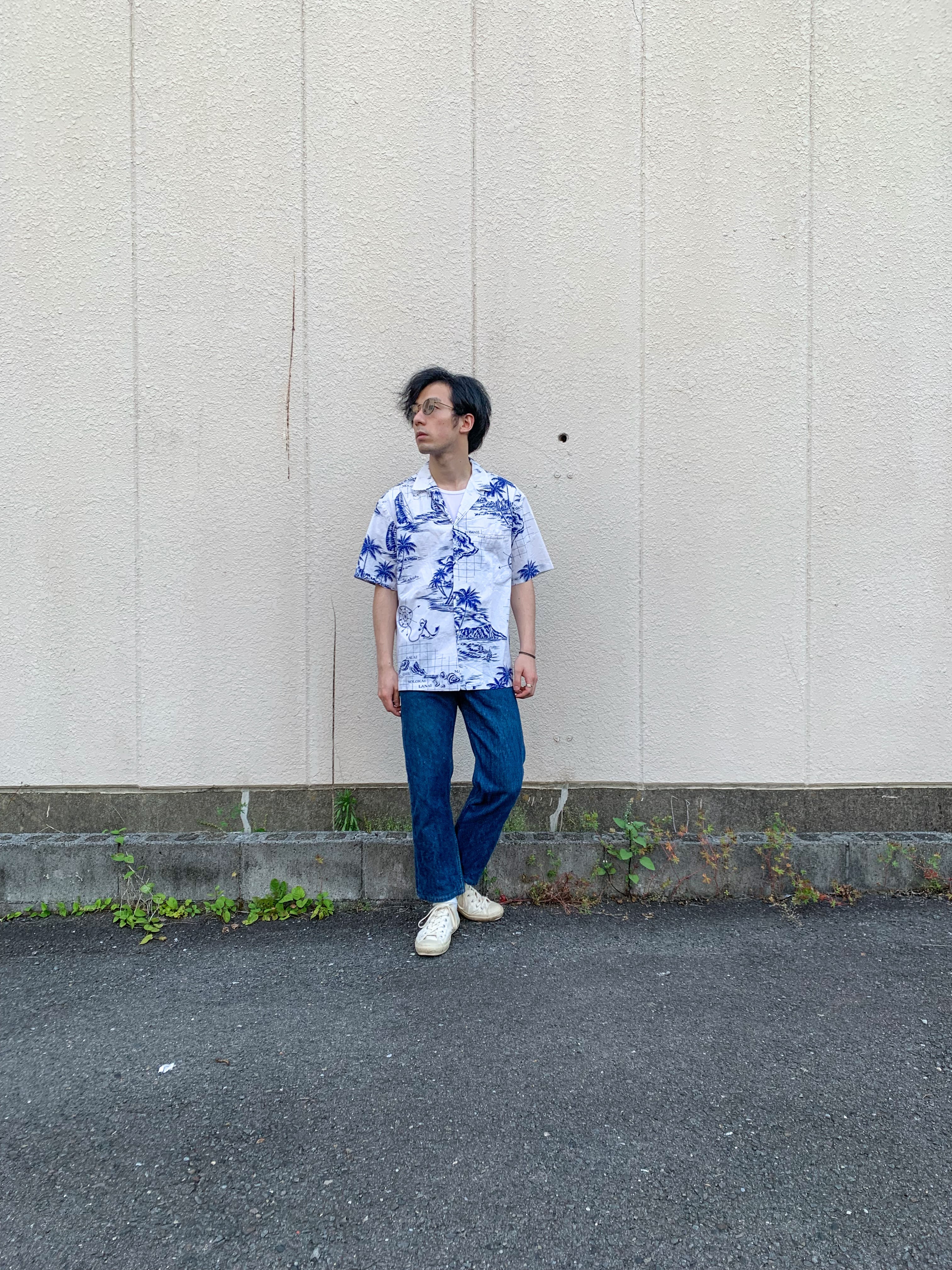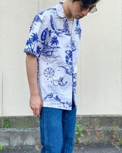 アロハシャツというと蛍光色などの強めの色が地色になっていて柄に使われる色数も多く多く、主張が強すぎる為観光先でしか着ないという方もいらっしゃると思います。ただこちらは白地に青というシンプルな配色。既存のスタイリングを邪魔しないいいのデザインです。