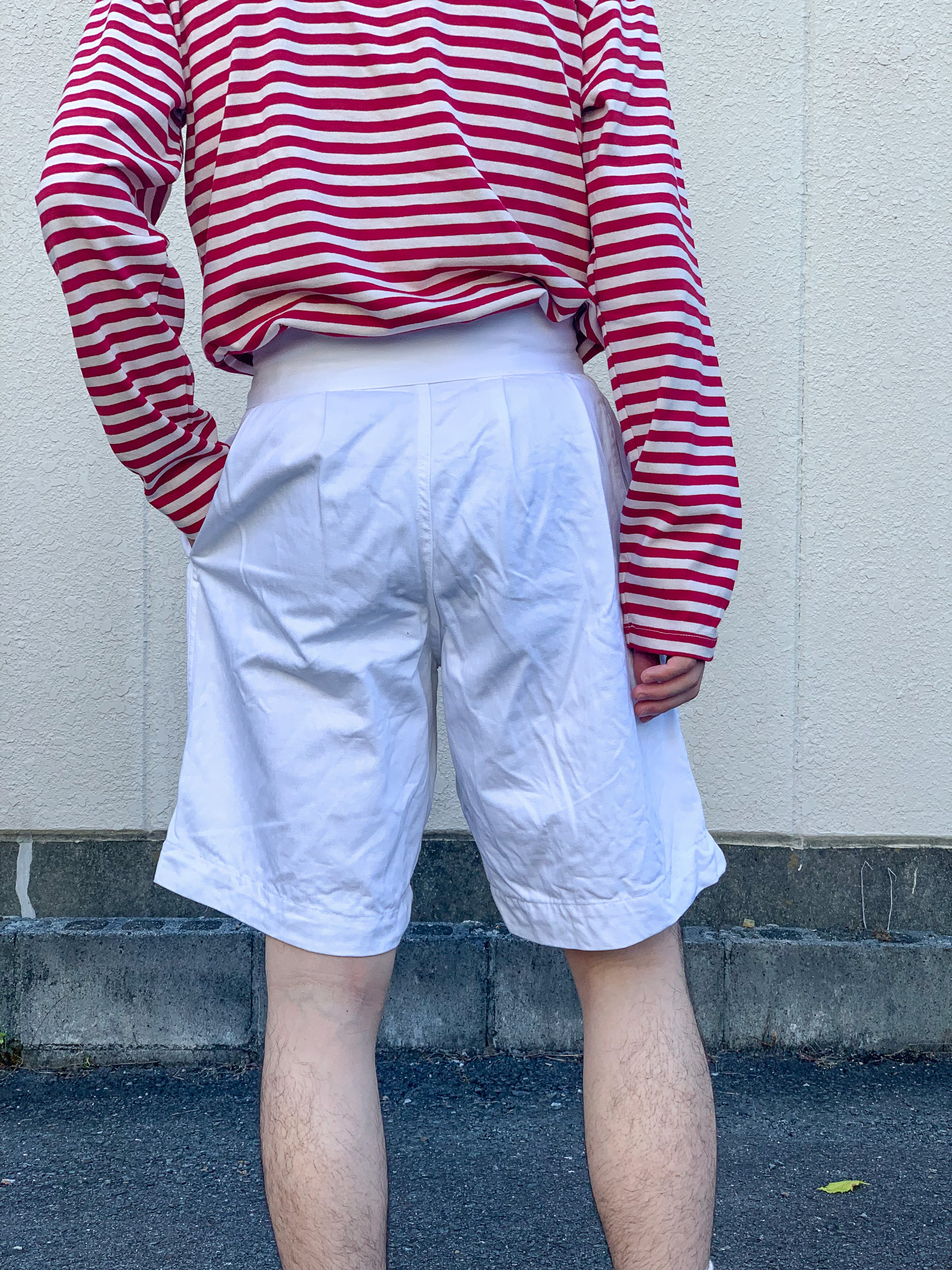 個人的に面白いと思ったのがバックのディテール。バックポケットがなくタックが入っているというなかなか他のショーツには見られない形になっております。
