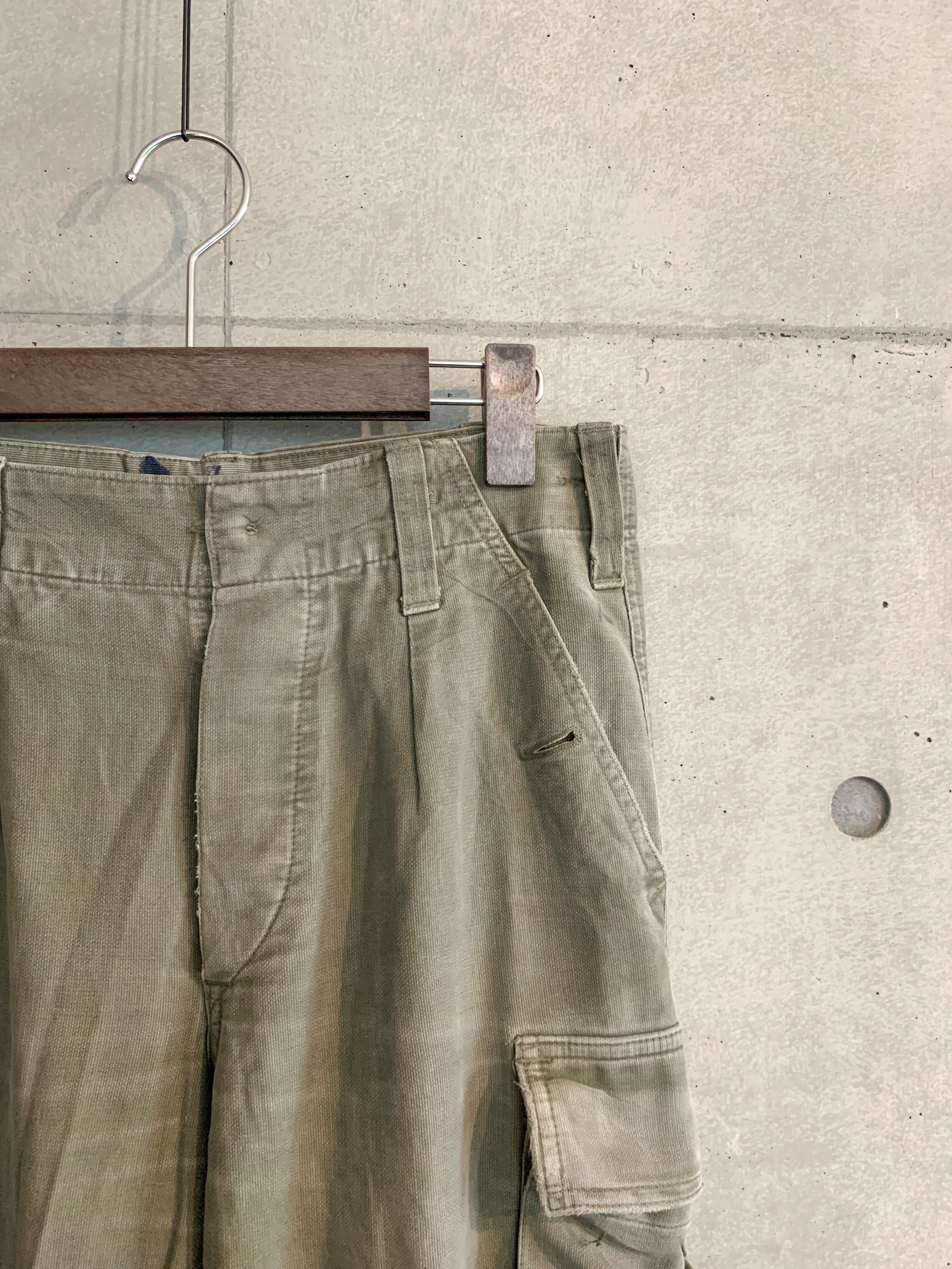 ディテールとしてはかなりシンプルで、カーゴポケットが2つと片側バックポケット、フロントボタンフライというヴィンテージの軍パンによくあるものです。