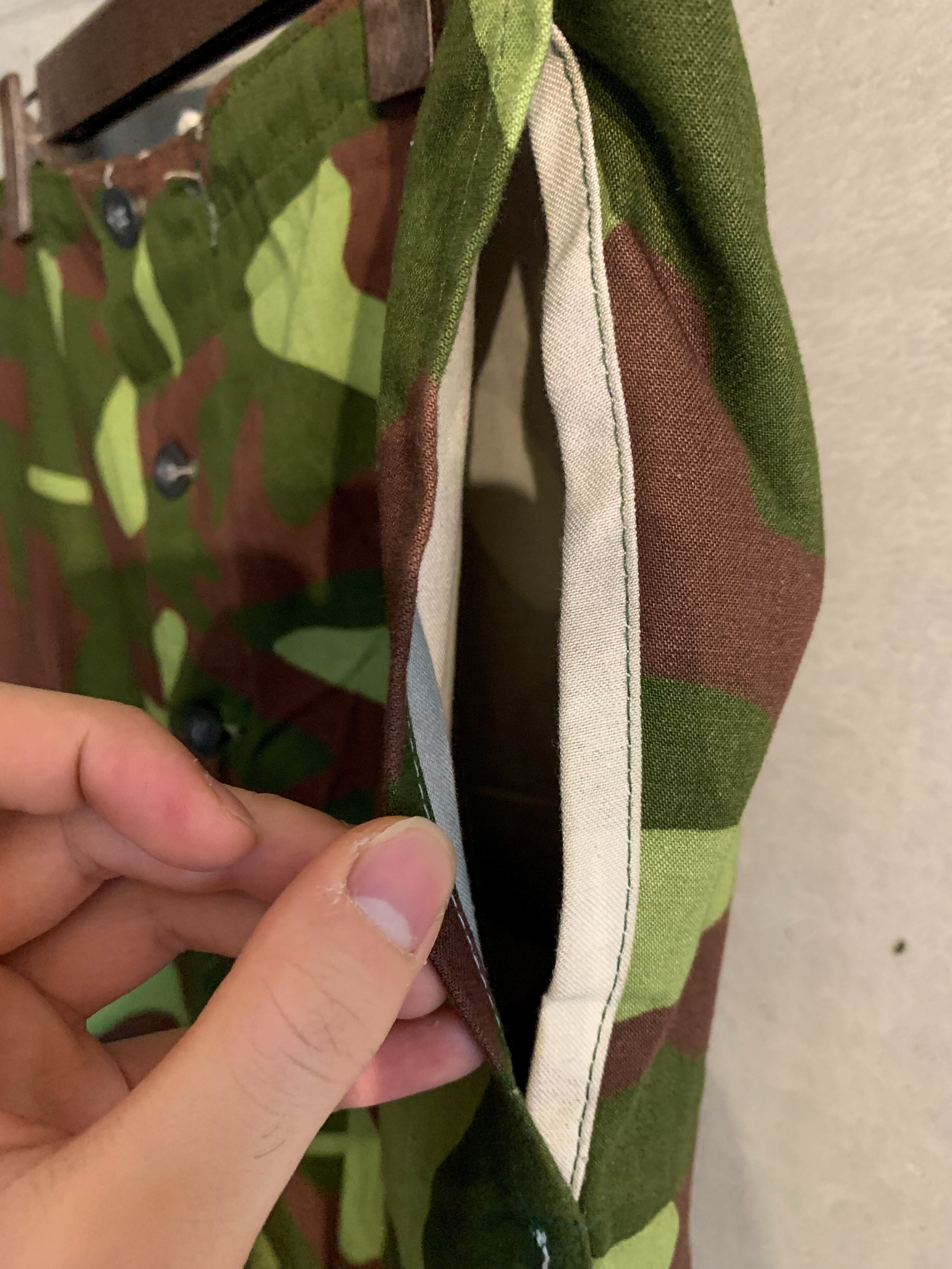 そしてこのパンツの一番の特徴と言えるのが、リバーシブル仕様である点。表面は先ほども説明したようにフィンランド軍特有のキューカンバーカモ。裏面は雪上戦闘で使用されるスノーカモの仕様になっています。なぜこんな作りになっているのか。フィンランドはスウェーデンの隣に位置する北欧の国で、雪に覆われる時期が長いためスノーカモのアイテムが基本だったのですが、1960年代辺りから森林でも使える迷彩を取り入れ始めました。今回のM-62はそんな過渡期に生まれたため、森林でも雪上でも使えるようにリバーシブル仕様になったと言われています。スノーカモの面を表にした時にうっすら透けて見えるキューカンバーカモが洒落ています。