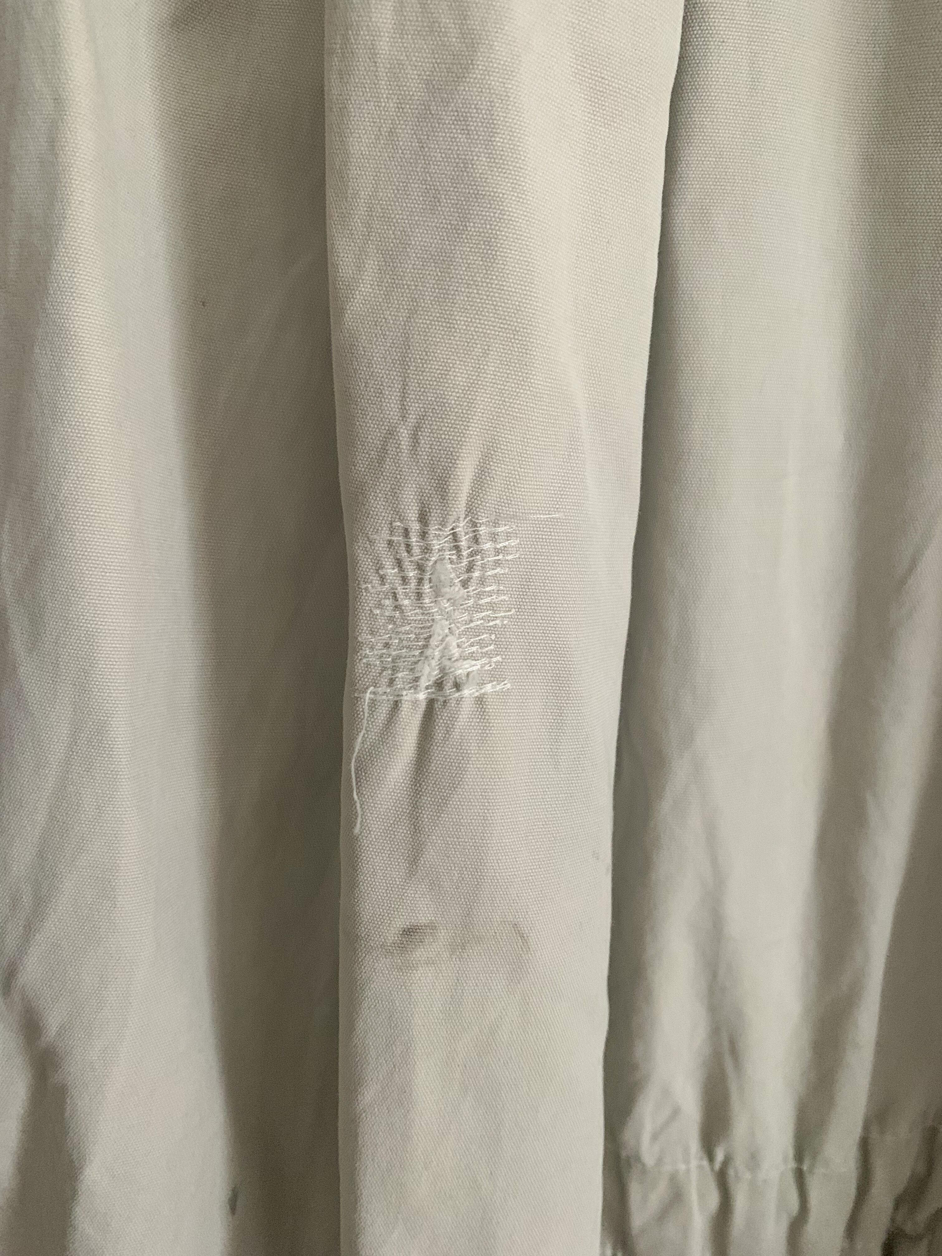 生地は程よい張りとシャリ感があるコットンポプリン。今回の個体はユーズドのもので所々リペアの跡や汚れ、ダメージがありますが、むしろこっちの方が自分の体に馴染むような感じあっておすすめです。