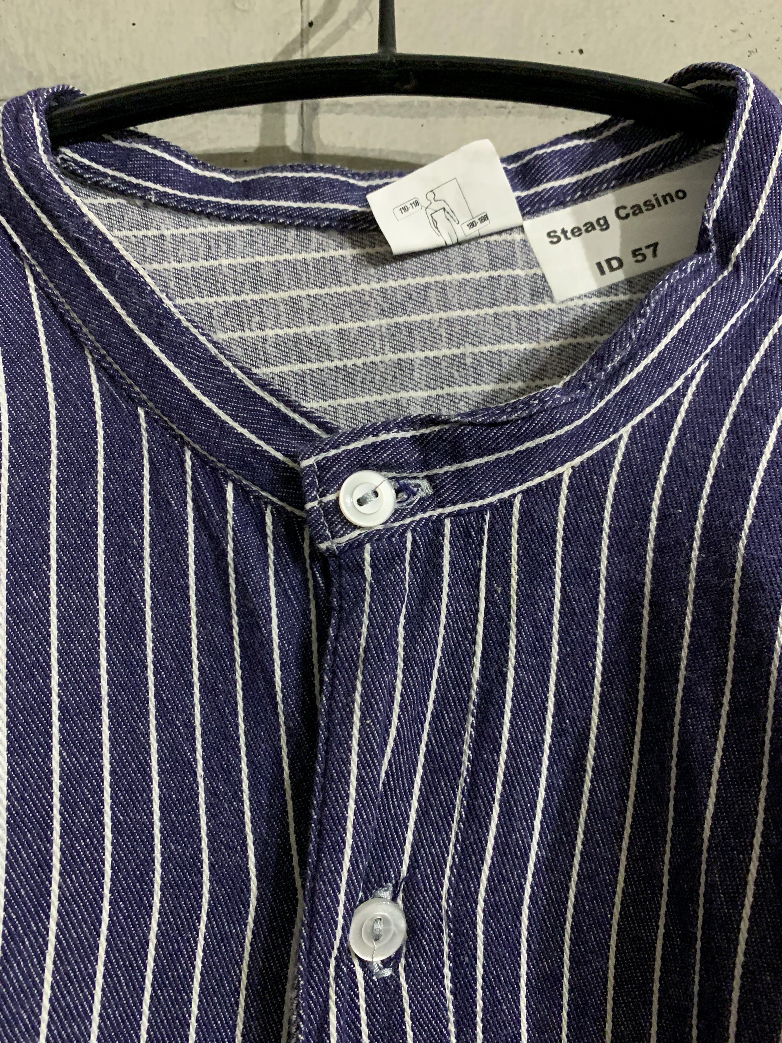 形としてはヨーロッパのグランパシャツに近しく、プルオーバーかつ長い着丈が特徴。ボタンを一番上まで閉めてバンドカラーシャツとして、ボタンを開けてフィッシャーマンスモックのようなアイテムとして2通りの使い方ができるのかなと思います。
