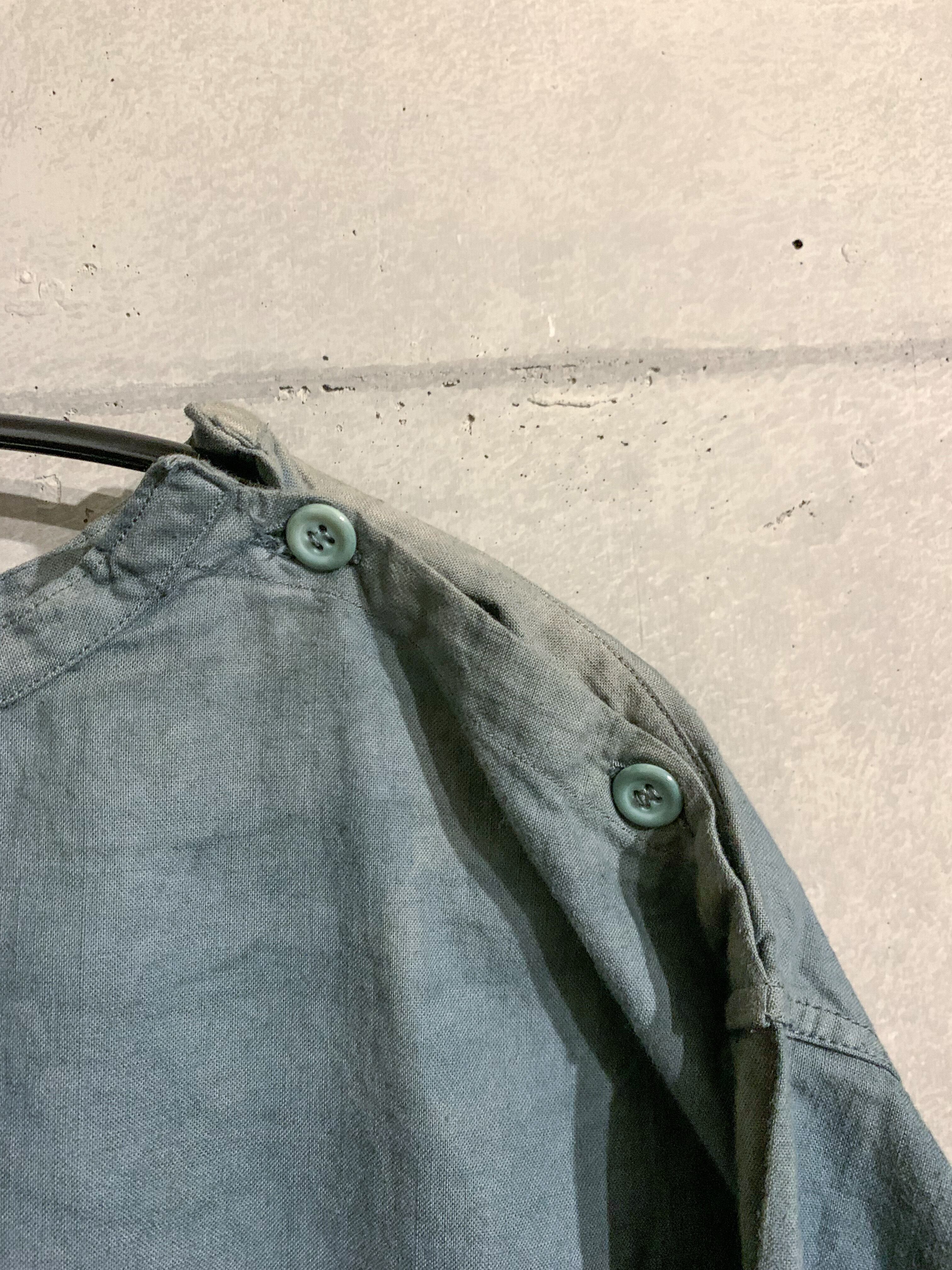 本来はホワイトのカラーリングですが、後染めによってグリーンカラーになっております。スイス軍のグランパシャツに近い色味で、濃すぎず淡すぎない使いやすいカラーリングだと思います。