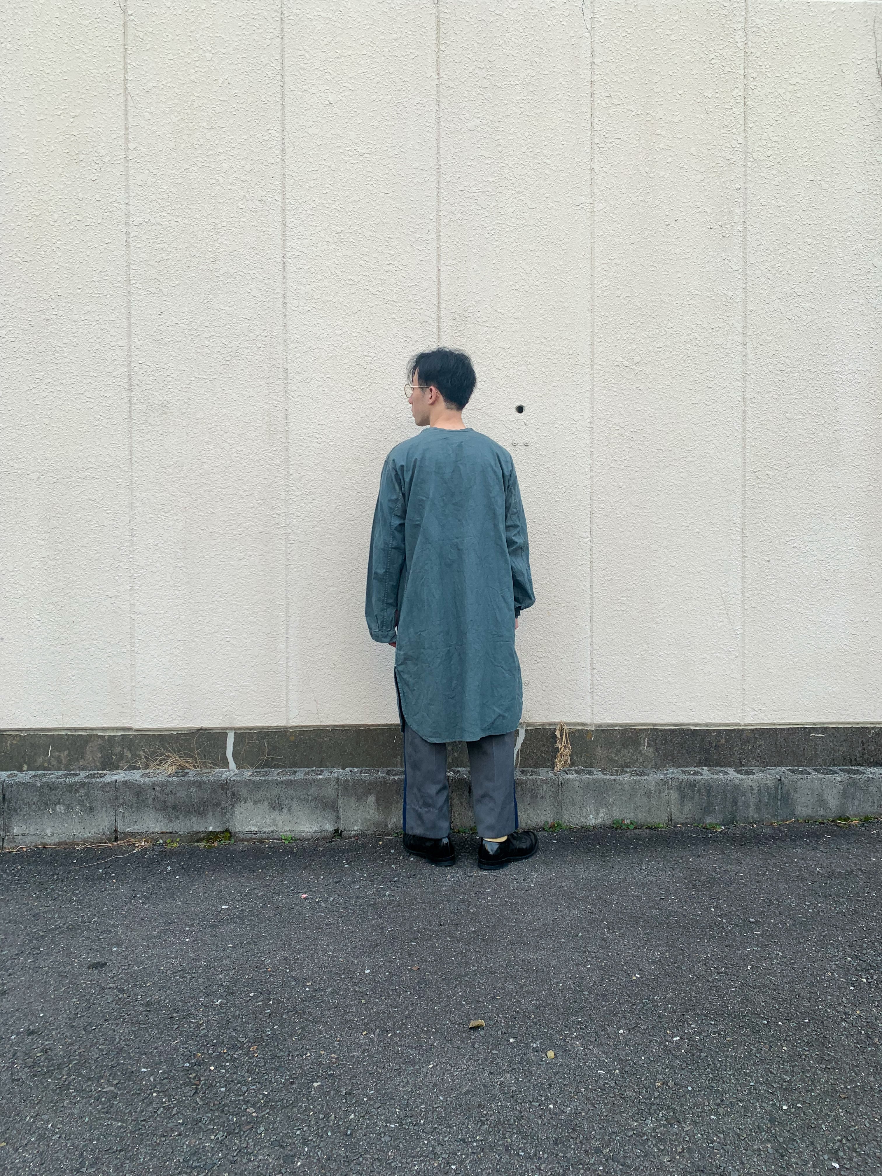 全体的なシルエットとしてはバンドカラーのグランパシャツのような感覚です。非常に着丈が長くスリットもかなり深めに入っているので、ジャケットやコートなどの重ね着も楽しめます。