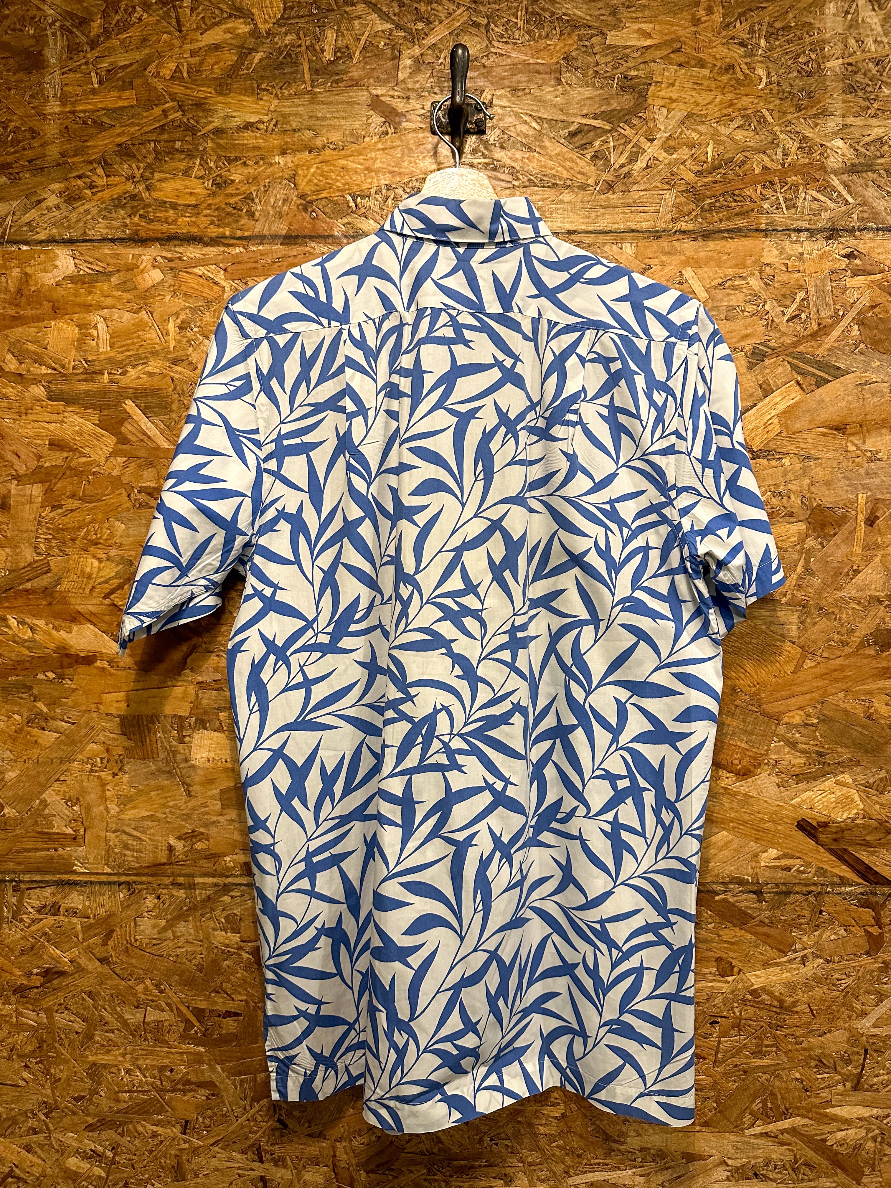 白地にブルーワントーンの柄なので一般的なアロハシャツよりは合わせやすい柄となっております。