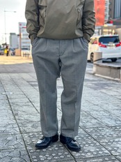 またフロントに2タックが入っていて太もも周りがワイドになっていて、そこから少しずつ細くなっていくワイドテーパードの形で、前からも横からも美しいシルエットになっております。